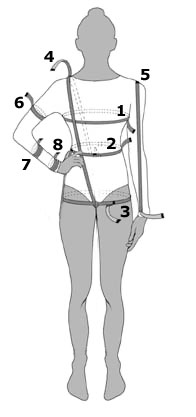 Keeping the tape against the small of the back, from the center of the shoulder, down the front, through the crotch, and up the back to the starting point.